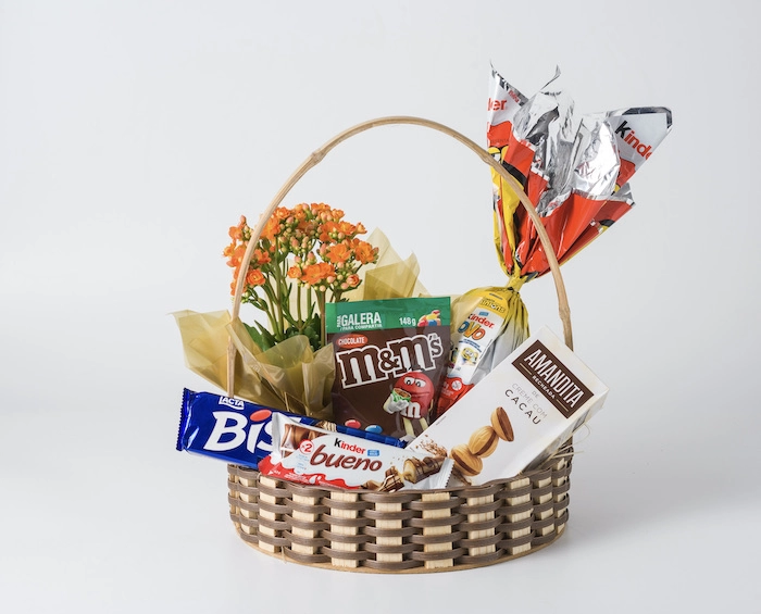 Deliciosa Cesta com diversos tipos de chocolate para presentear com a Isabela Flores. Uma deliciosa combinação de chocolates e um delicioso Ovo de Páscoa Kinder